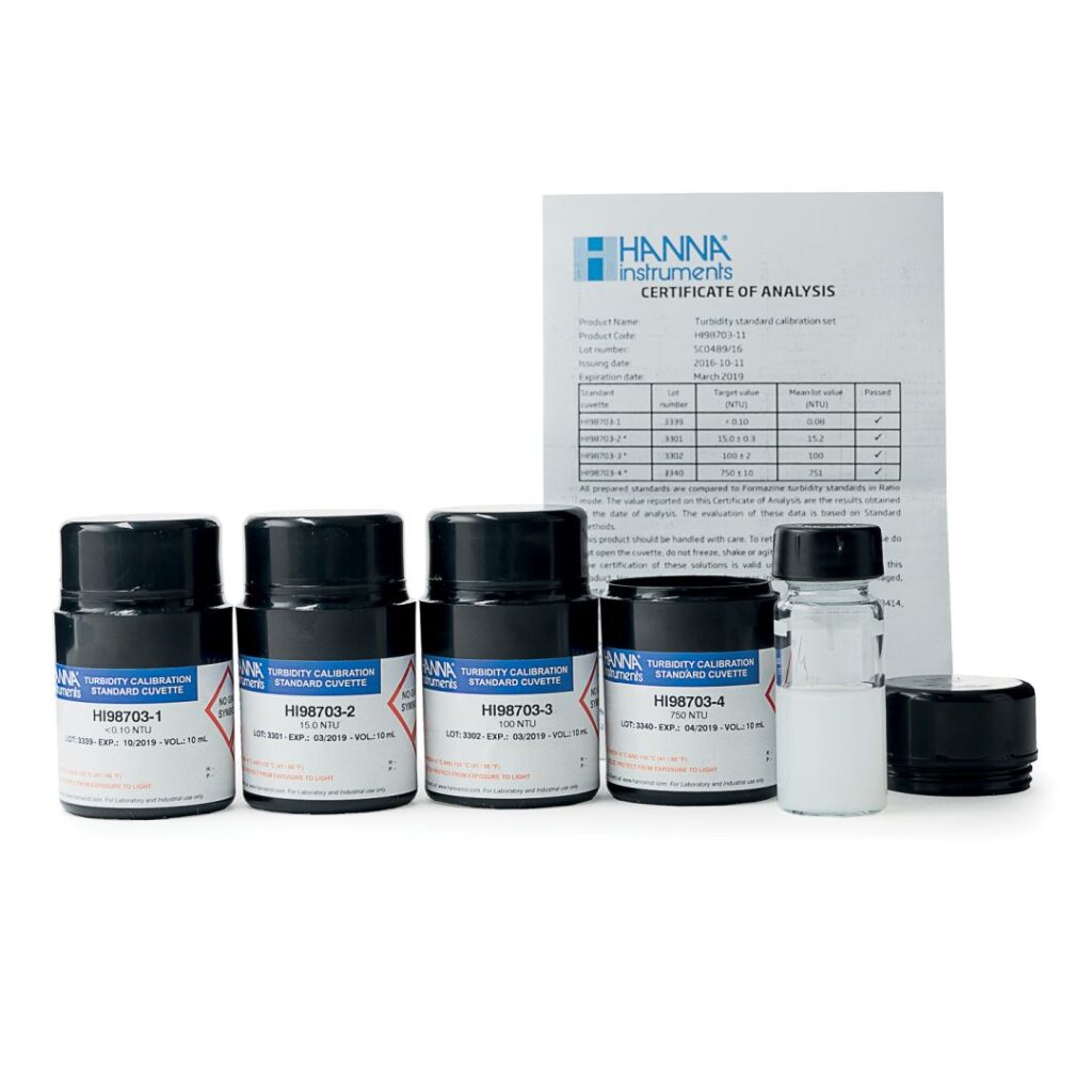 Turbidité 15, 100 et 750 NTU et solution zéro turbidité (1 lot)
