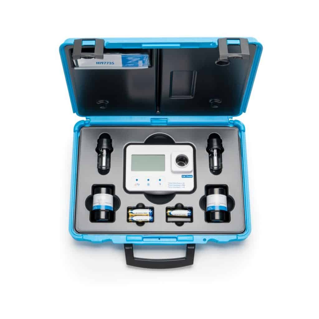 Livré en mallette de transport avec cuvettes, solutions étalons, tissus de nettoyage, ciseaux et piles, sans réactifs