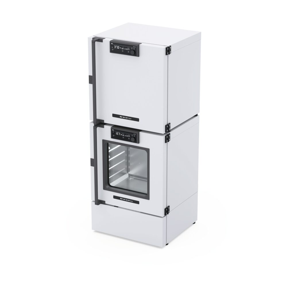 Up to two IKA incubators can be safely stacked. An INC 125 F (incubator) can be placed on top of the INC 125 FCS (IO S 2.10 Stacking kit required)