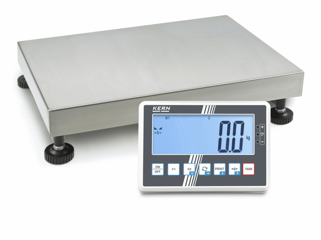 Plateforme : Plateau de pesée inox, structure en acier laqué, capteur en aluminium à revêtement silicone avec protection contre la poussière et l‘eau IP65