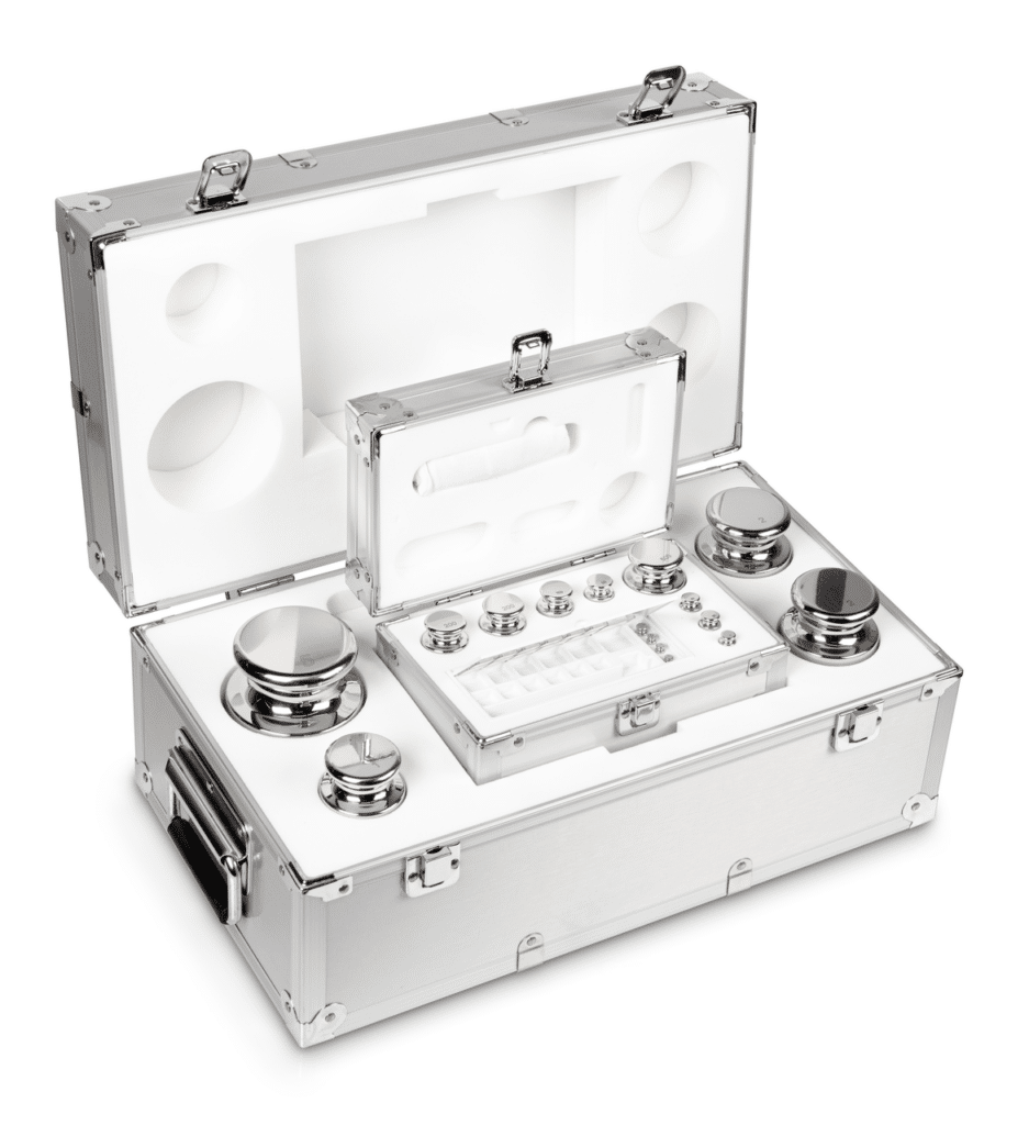 Jeu de poids, F1, 1 g - 5 kg, Bouton, inox poli (OIML), dans un boîtier en aluminium
