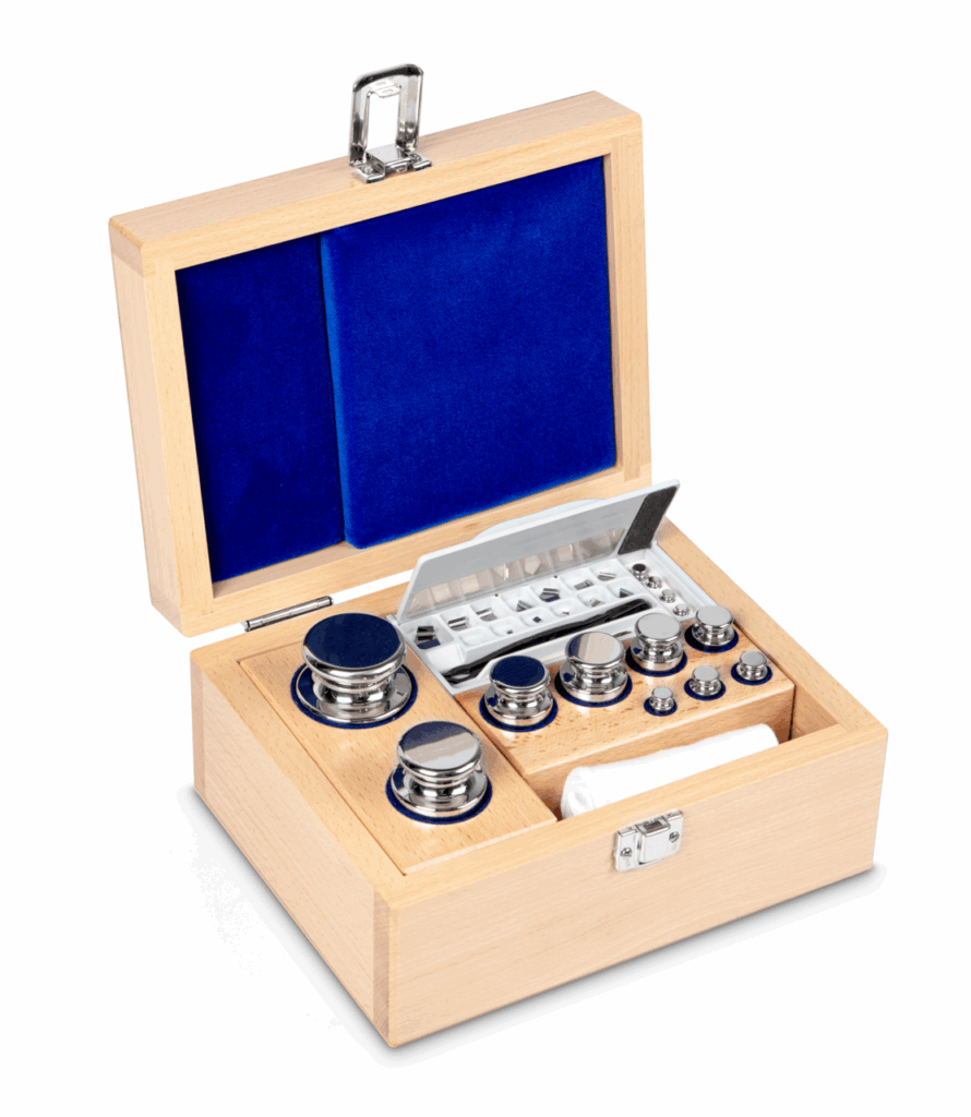 Jeu de poids, F1, 1 mg - 1 kg, Eco-formulaire, inox poli (OIML), dans une caisse en bois