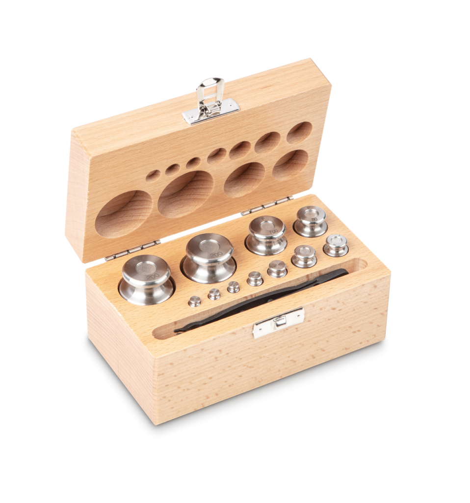 Jeu de poids, F2, 1 g - 200 g, Bouton, inox finement tourné (OIML), dans une caisse en bois