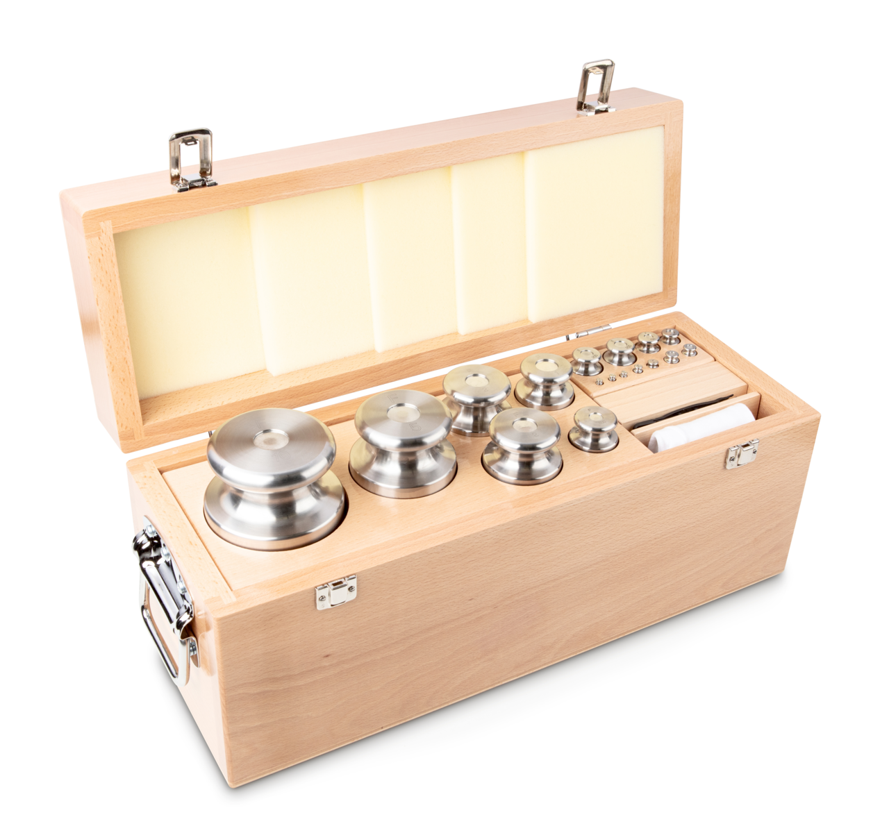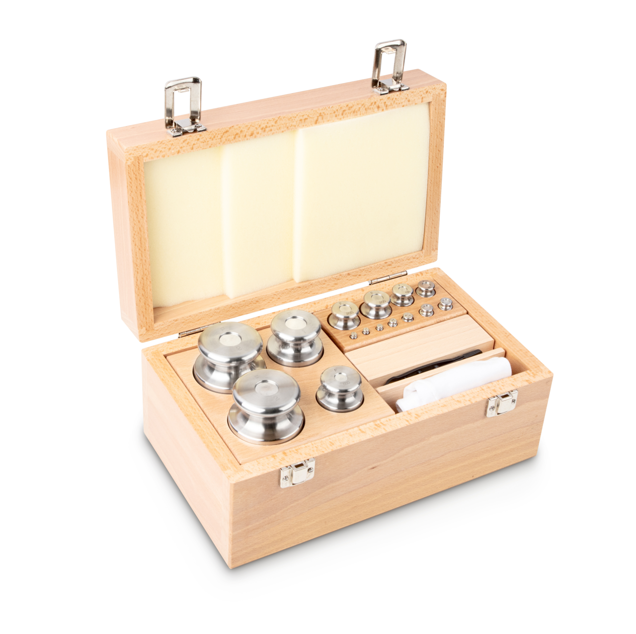 Jeu de poids, F2, 1 g - 200 g, Bouton, inox finement tourné (OIML), dans un étui en plastique