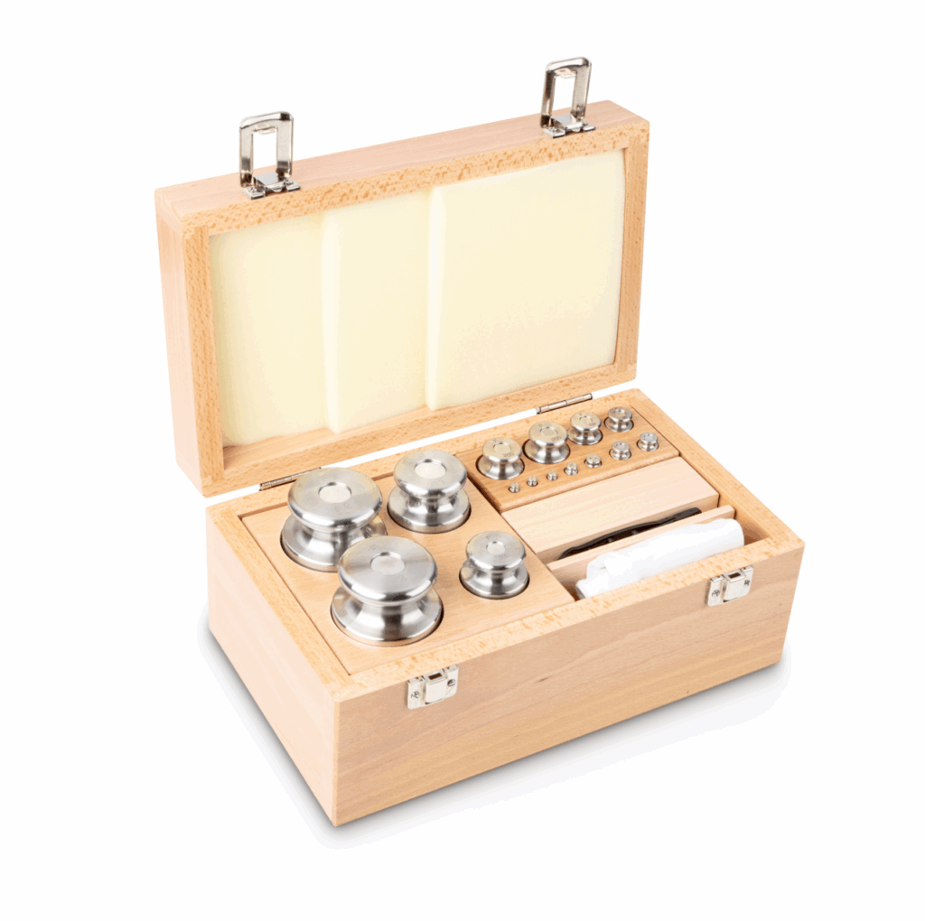 Jeu de poids, F2, 1 g - 2 kg, Bouton, inox finement tourné (OIML), dans une caisse en bois