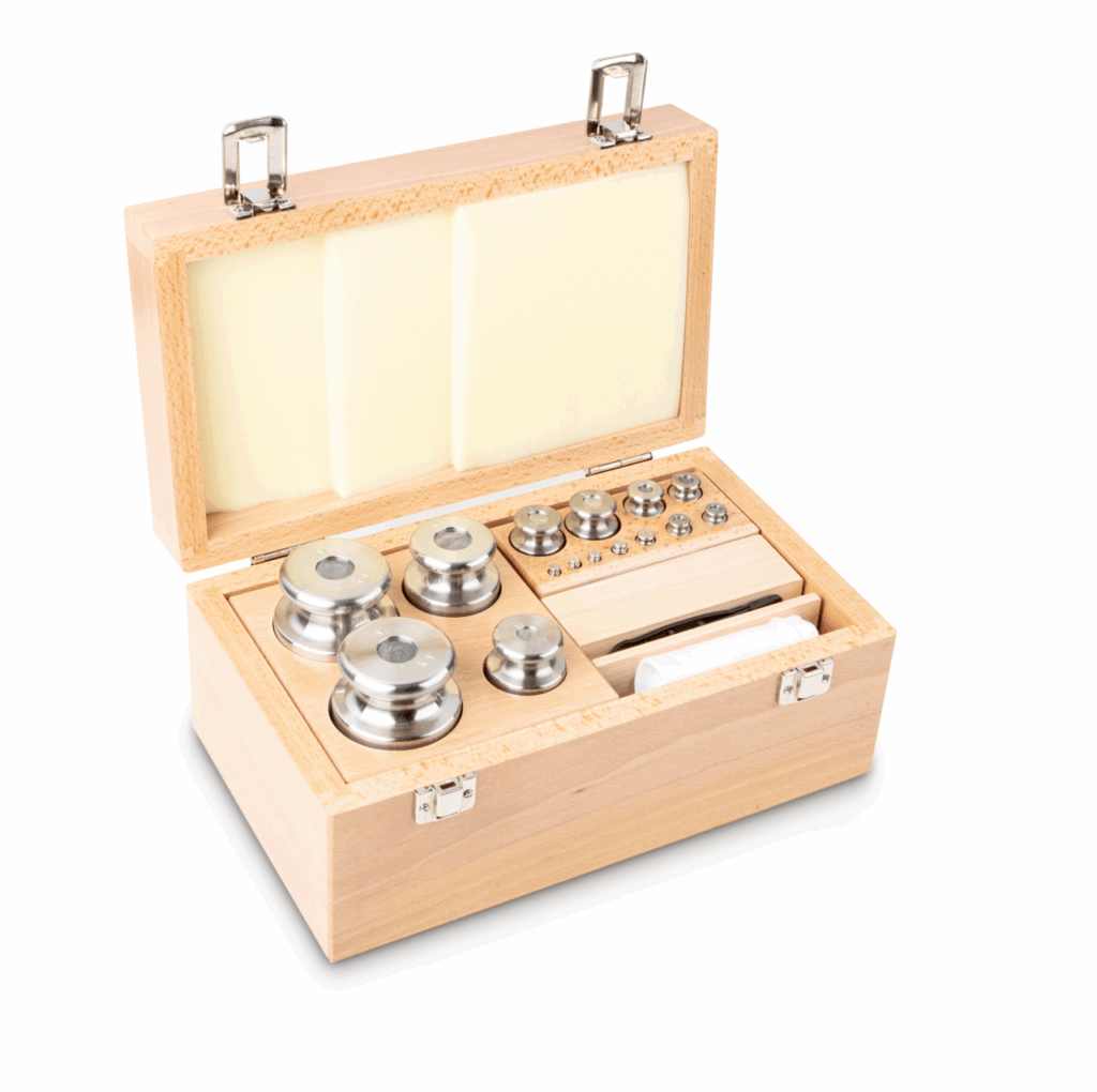 Jeu de poids, M1, 1 g - 2 kg, Bouton, inox finement tourné (OIML), dans une caisse en bois