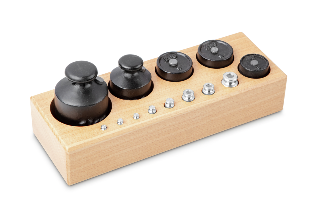 Jeu de poids, M3, 1 g - 1 kg, acier inox (1 g - 50 g) et fonte laquée (≥ 100 g), bouton (≤ 50 g, ≥ 500 g) et cylindre (100 g, 200 g), dans un bloc de bois