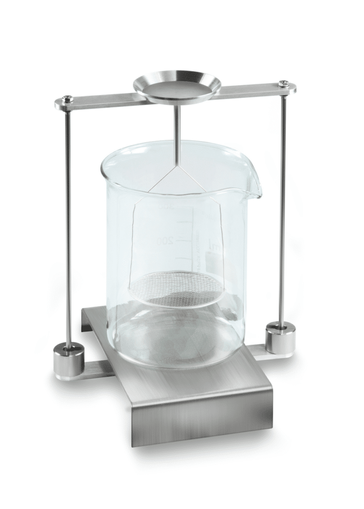 Le fil métallique du bac d’immersion a un diamètre de 0,5 mm et correspond ainsi aux exigences de la norme DIN EN ISO 1183-1 (Méthode de détermination de la masse volumique des plastiques non alvéolaires)