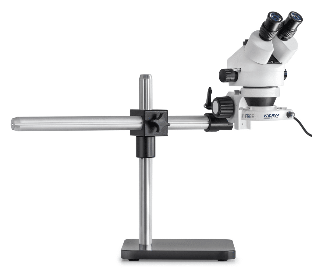 Le support de bras télescopique universel vous offre un maximum de flexibilité. Particulièrement adapté aux grands échantillons et au travail libre sous le microscope