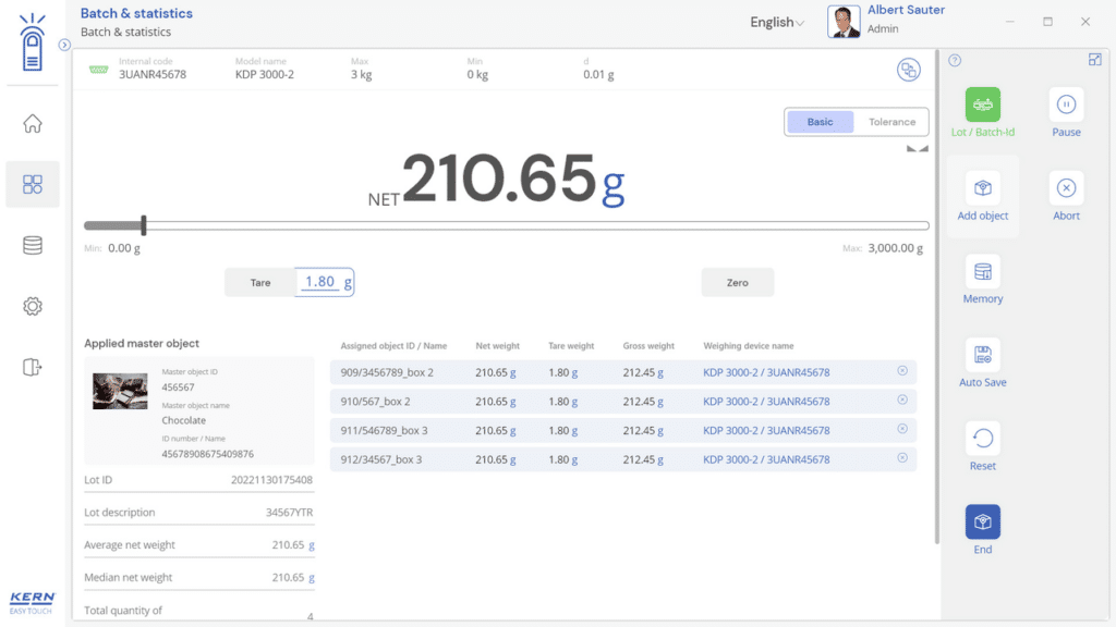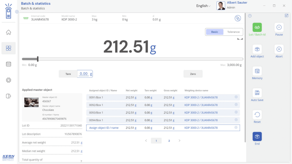 Batch and Statistics sert à peser un groupe d’éléments en rapport avec une identification de groupe, par exemple plusieurs artivles d’un même lot de production/ID de lot. Tous les éléments de ce groupe peuvent être imprimés dans un formulaire. Le système calcule automatiquement les indicateurs statistiques de façon centrale