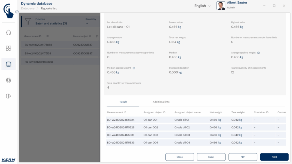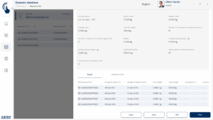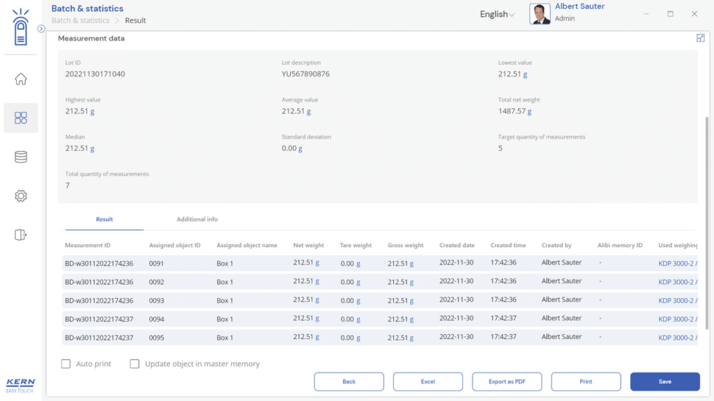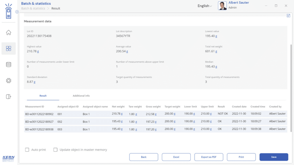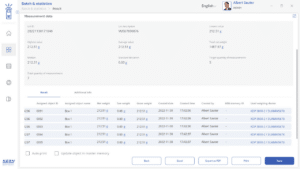 Toutes les valeurs mesurées sont enregistrées séparément avec mention du numéro de lot central. De plus, tous les objets peuvent être désignés séparément avec un numéro et un nom d’ID individuels