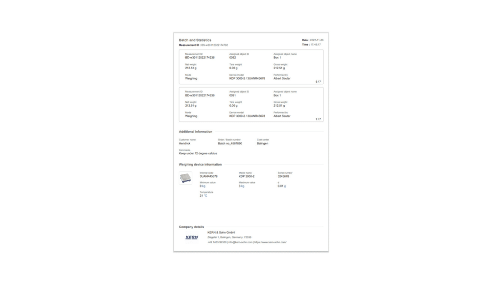 Toutes les données de mesure sont imprimées avec le poids brut, le poids net et le poids de la tare. Les valeurs mesurées peuvent être déterminées sur différentes balances. C’est pourquoi l’impression indique aussi la balance sur laquelle les mesures ont été effectuées