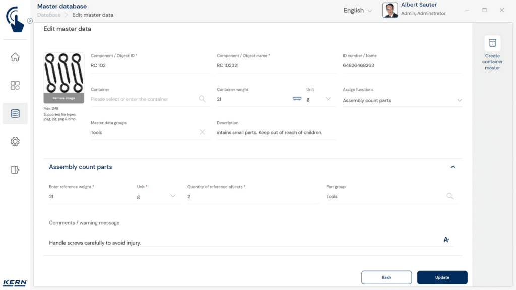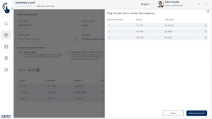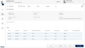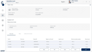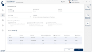 Chaque article de la liste de pièces peut être créé avec ses propres données de base, comme par exemple le poids de référence par pièce ou le numéro d’identification. Le numéro d’identification permet d’identifier l’article par scan du code-barres. Le scan permet d’être sûr de ne pas ajouter de pièces incorrectes