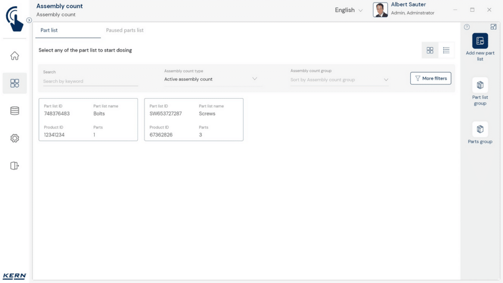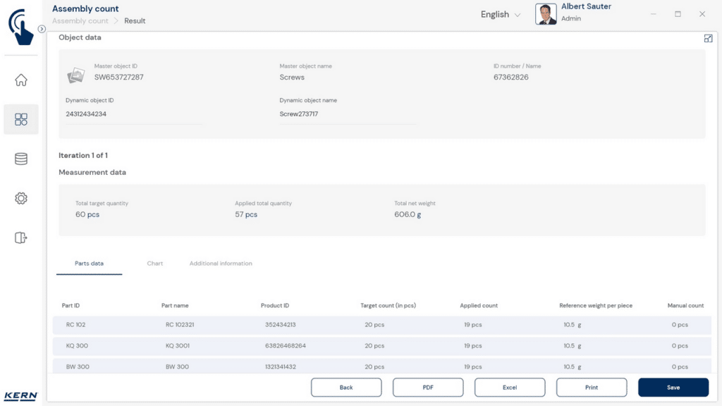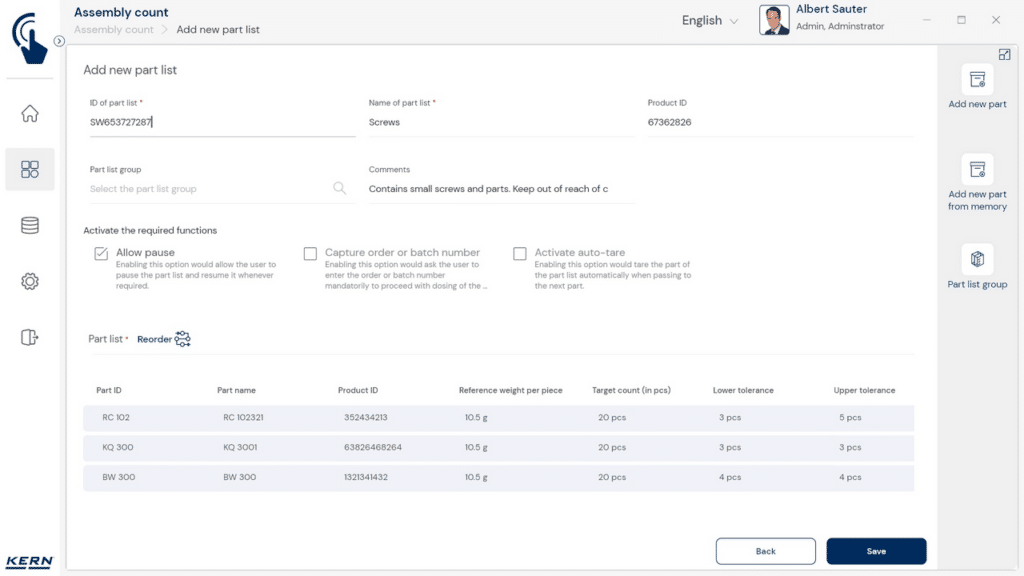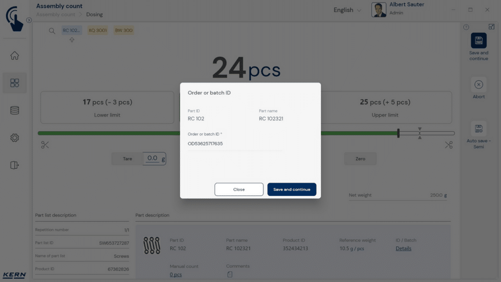Assembly Count permet cela en définissant avec précision la quantité cible par pièce et garantit le respect de cette quantité en comptant chaque pièce sur la balance (processus de comptage gravimétrique des pièces)