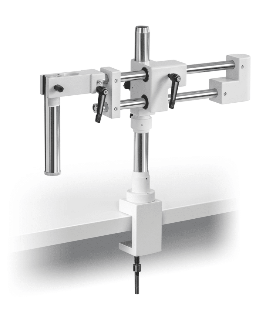 Le support universel à articulation à ressort avec pince de platine vous facilite le travail au quotidien avec votre microscope stéréo. Désormais avec vis macrométrique pour une mise au point facile et souple.