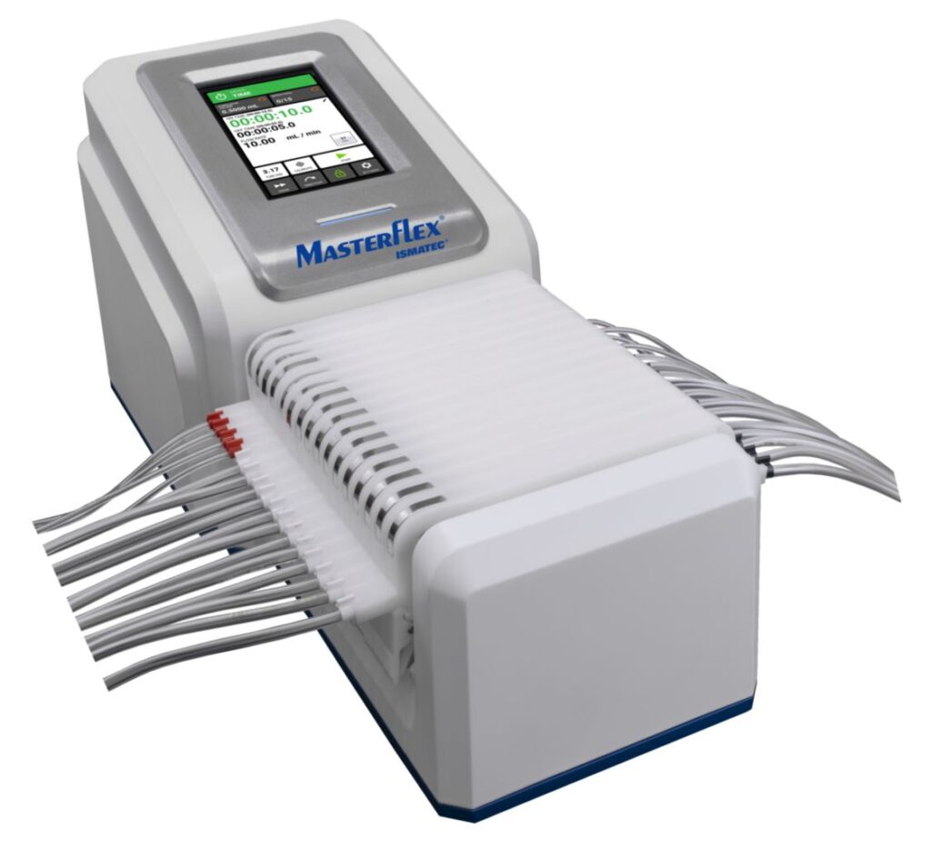 These Ismatec® IPC multichannel pumps feature planetary gears that drive eight stainless steel rollers in unison for smooth rotation and accurate liquid flow