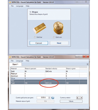 Le logiciel SAUTER SSG (incluse) permet de calculer la vitesse du son pour différents alliages de métaux précieux. Il est ainsi possible de déterminer si les pièces ou les lingots contiennent de faux noyaux ou s’ils sont constitués d’un seul et même matériau. Compatible avec les systèmes d’exploitation suivants : Windows® 7/8/10