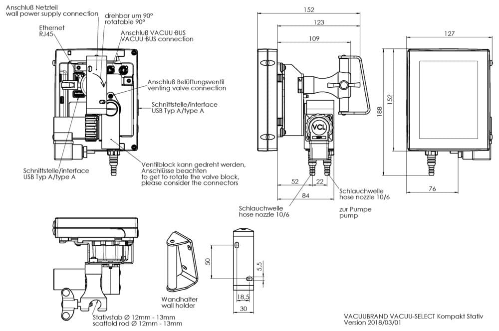 | Matériaux des composants (sans étanchéité) | VACUU·SELECT régulateur compact avec fixation pour statif, avec électrovanne de régulation, PVDF/plastique fluoré, 100-230V / 50-60Hz, prise CEE/CH/UK/US/AUS/CN |