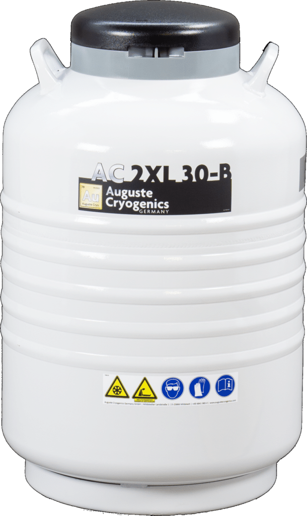 The aluminum vessels of the L | XL | XL+ | 2XL -series from the Auguste Cryogenics Medical Family are cryogenic freezer containers for long-term storage of biogenic sample material in liquid nitrogen - with many possible applications in laboratories and technology