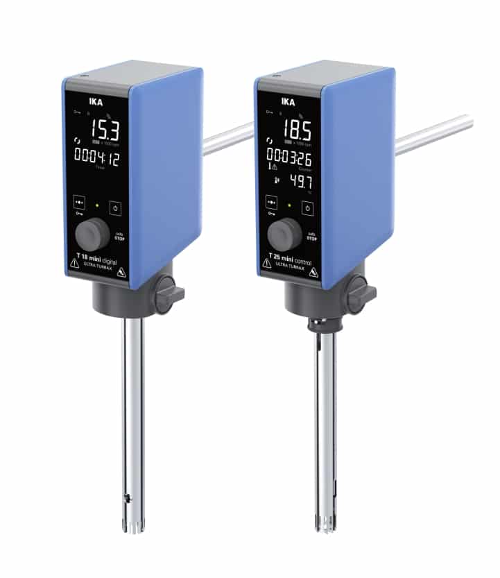 The T 25 mini control is a high-performance dispersing instrument with a wide speed range of 600 - 25,000 rpm for working volumes of up to 1.5 liters (H20)