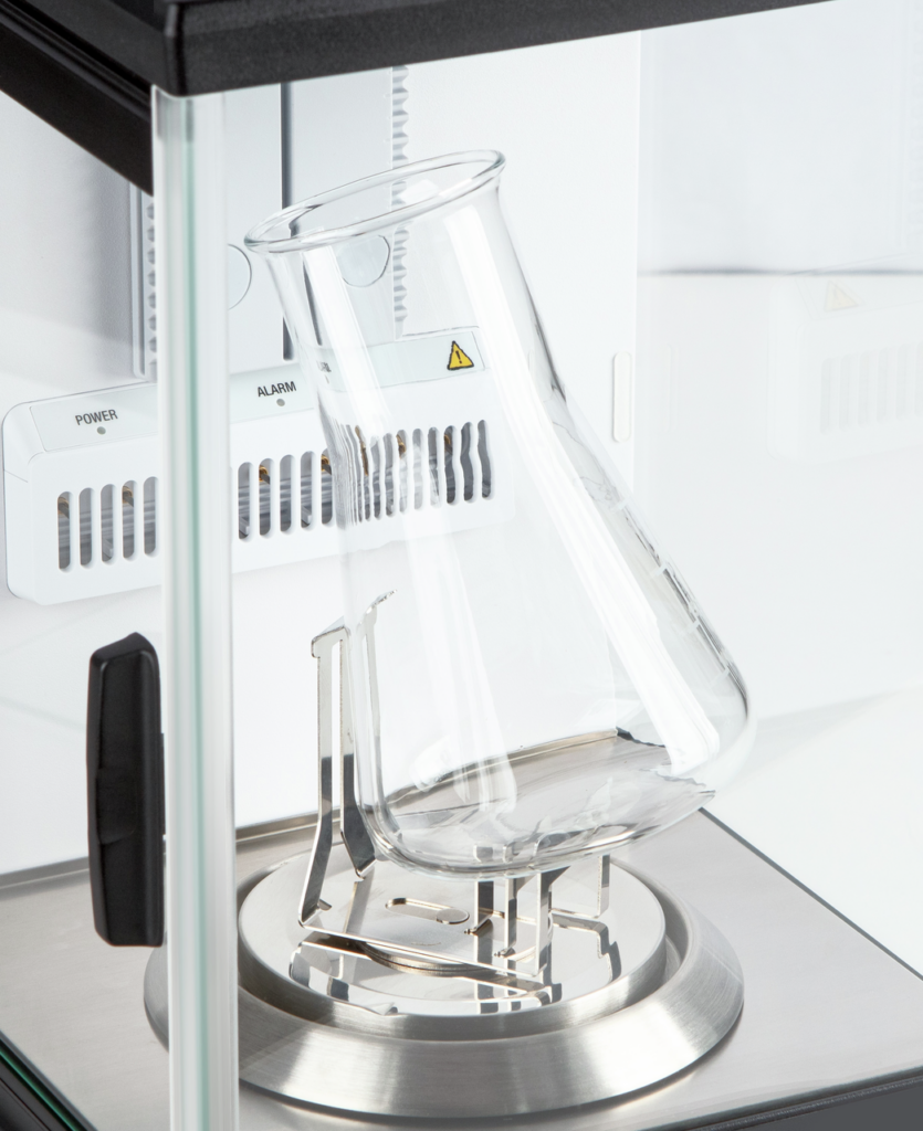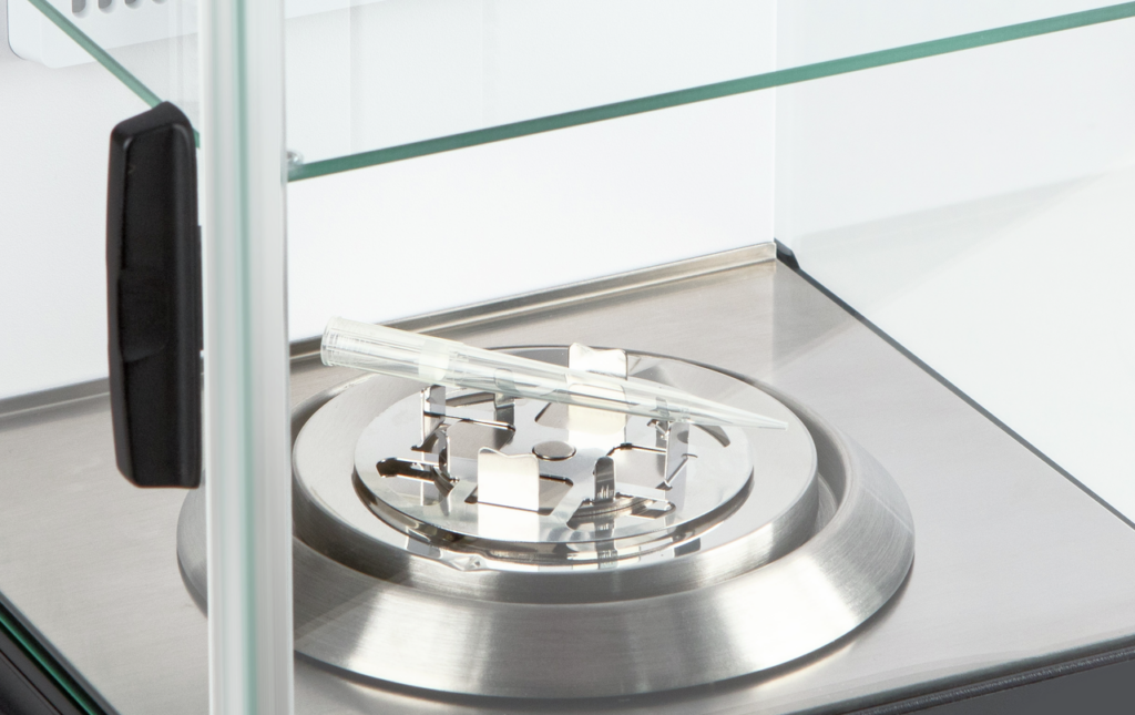 Multifunctioneel weegplateau bij de levering inbegrepen, reduceert de invloed van luchtstromingen in de weegruimte tot een minimum en verbetert daardoor de insteltijd en herhaalbaarheid aanzienlijk. Bovendien kunnen monsters die uitsteken, papier voor monsters, PCR-reservoirs, microcentrifugebuisjes e.d. makkelijk gefixeerd en probleemloos gewogen worden