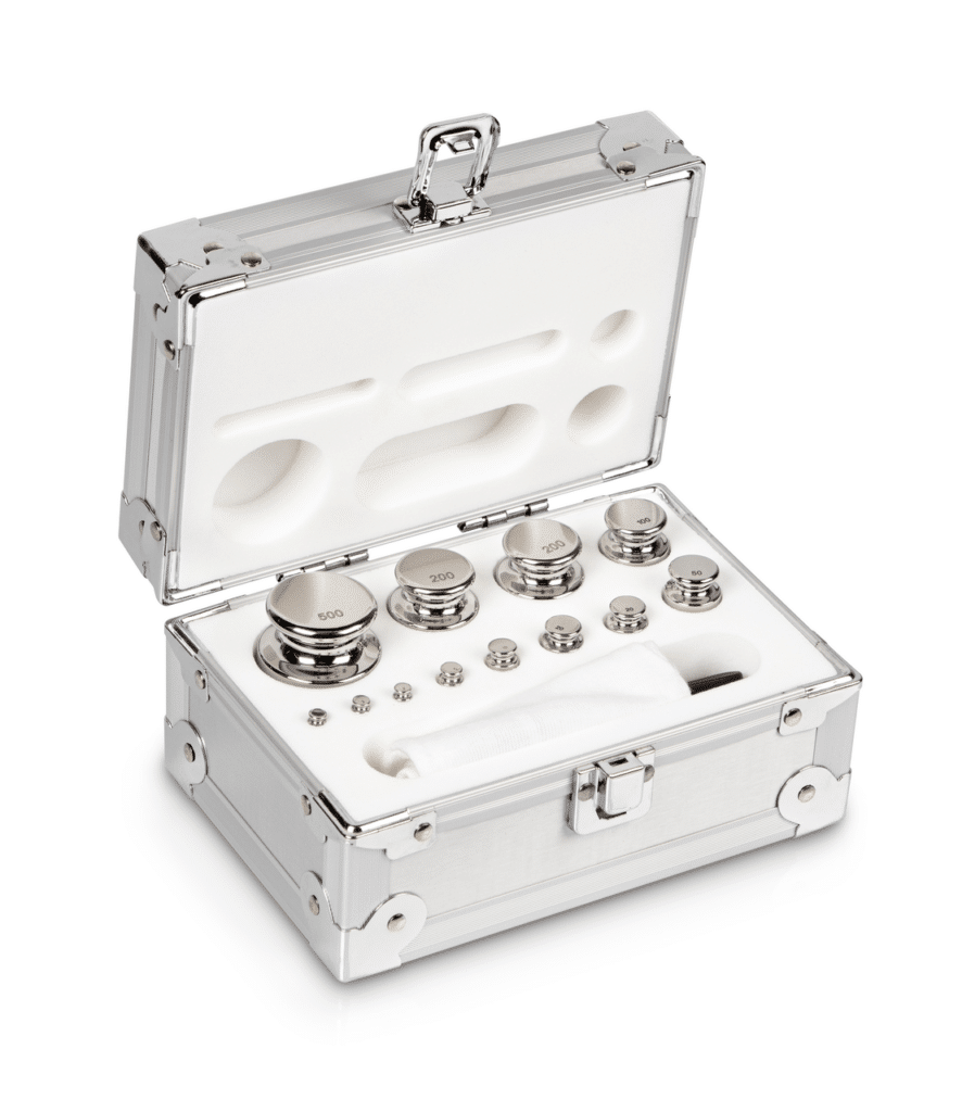 Gewichtenset, F1, 1 g - 500 g, Knop, roestvrij staal gepolijst (OIML), in aluminium behuizing