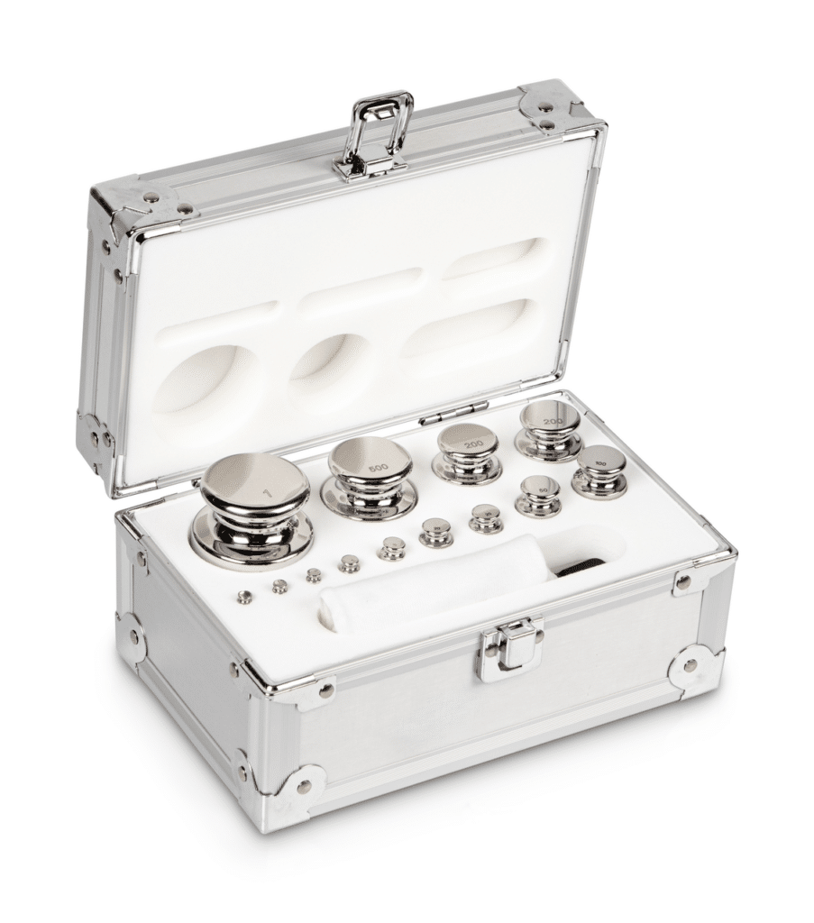 Gewichtenset, F1, 1 g - 1 kg, Knop, roestvrij staal gepolijst (OIML), in aluminium behuizing