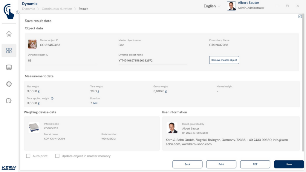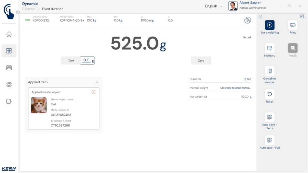 Centraal geheugen met stamgegevens: dynamische weegobjecten kunnen in het geheugen van het systeem met meetduur (in sec.), naam, ID-nummer, afbeelding enz. worden opgeslagen. Daardoor hoeven deze gegevens niet steeds opnieuw ingevoerd te worden, maar kunnen ze gewoon uit het geheugen worden opgeroepen. In het geheugen met stamgegevens kan ook een mogelijke tarrawaarde van de typische verpakking, box of houder worden opgeslagen. Deze waarde wordt dan automatisch van het weegresultaat afgetrokken (Pre Tare)