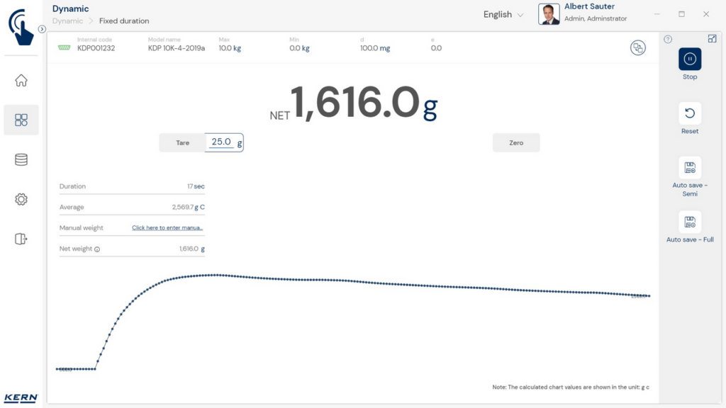 Het dynamische weegresultaat verschijnt in ‚kg C‘ of ‚g C‘. ‚C‘ geeft aan dat het weegresultaat als gemiddelde waarde is berekend
