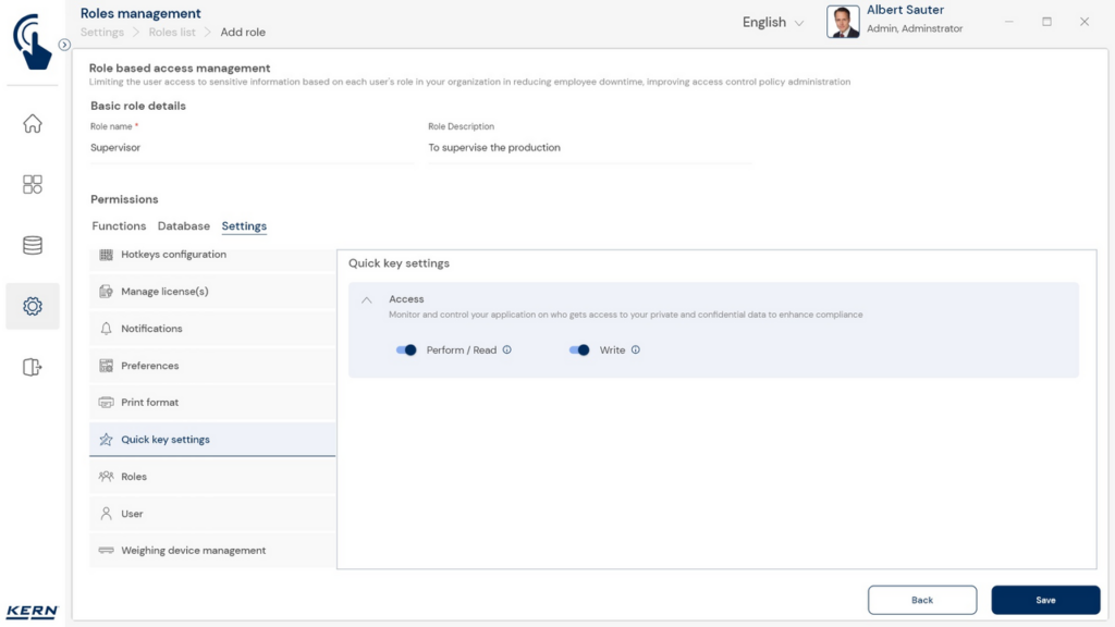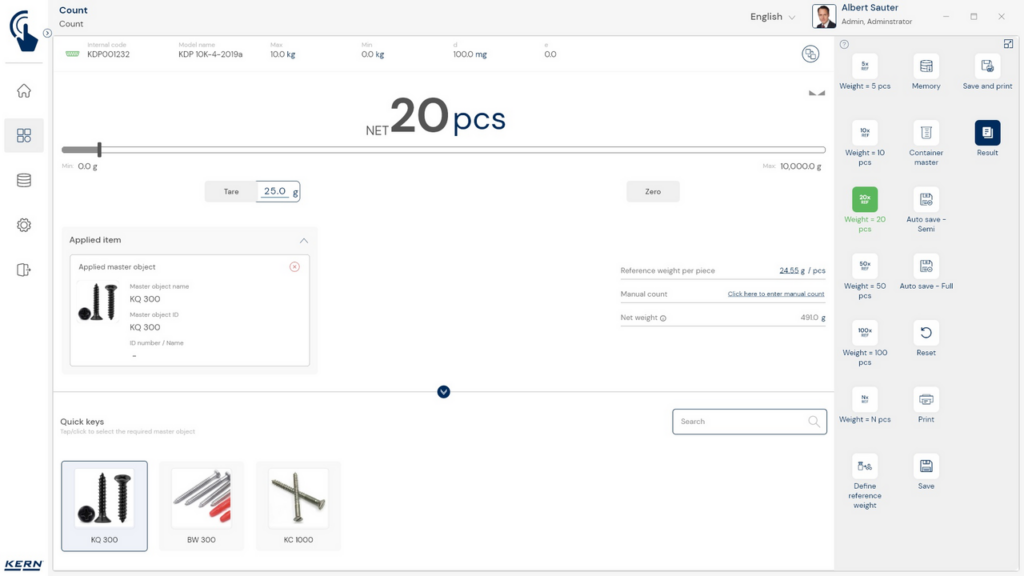 Opslaan: ongeacht of het resultaat op de conventionele manier of per Quick Key verkregen is, elk resultaat van een weging of stuktelling wordt opgeslagen met verwijzing naar het geselecteerde stamgegevensobject
