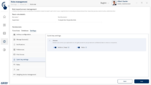 Gebruikersspecifiek: de Quick Keys kunnen aangelegd worden als schema met het oog op bepaalde gebruikersrollen. Dit betekent dat de gebruikers van een bepaalde rol bepaalde stamgegevensobjecten te zien krijgen voor een snelle selectie. Hierdoor kunnen bijvoorbeeld verschillende afdelingen in hetzelfde bedrijf met verschillende stamgegevens werken zonder dat deze elkaar overlappen