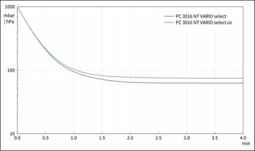 Voor de verdamping van oplosmiddelen detecteert de VACUU·SELECT regelaar het kookpunt en past hij automatisch het vacuümproces aan indien nodig